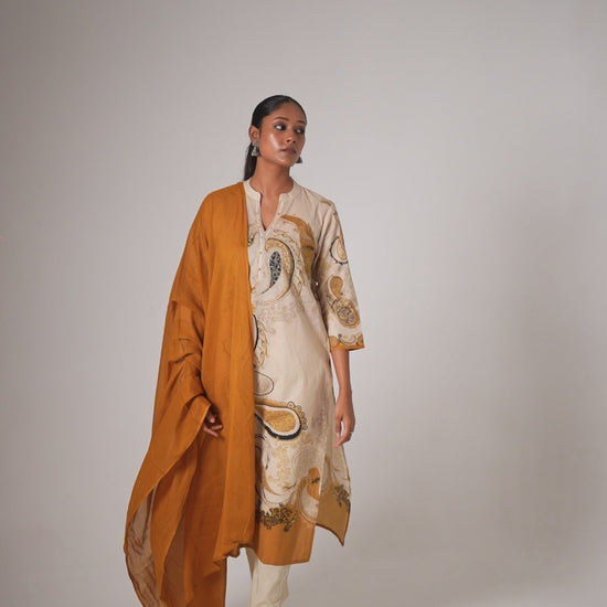 Handcrafted with the charm of Jaipur prints, the Aafreen Mustard Pure Jaipuri Cotton Suit Set is a blend of artistry and comfort. The kurta features intricate paisley block prints in earthy tones, complemented by a mustard border and matching dupatta with tassel details. Paired with solid cotton pants, this three-piece set is light, breathable, and perfect for all-day wear. Whether for summer outings, festive gatherings, or casual chic, this suit set embodies timeless Rajasthani craftsmanship.
