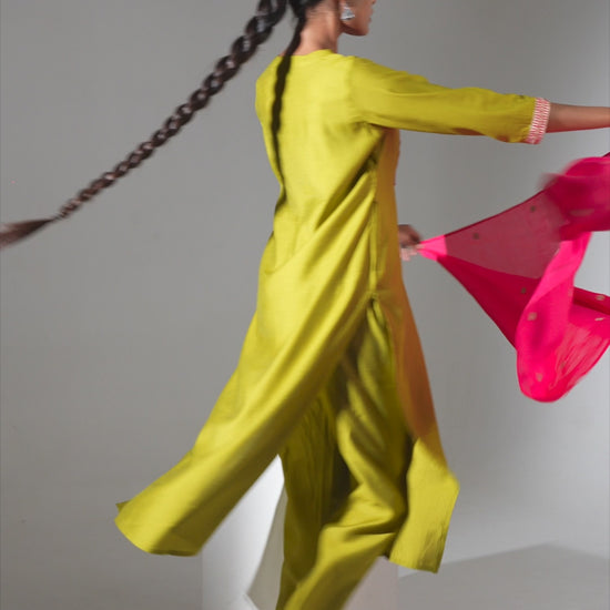 Bright, bold, and undeniably elegant — the Amaira Parrot Silk Suit Set brings heritage artistry to contemporary silhouettes. The pure silk kurta features intricate threadwork and appliqué embroidery in contrasting hues, adding richness to its vibrant parrot green base. Paired with straight silk pants and a striking fuchsia mul chanderi dupatta with delicate motifs, this ensemble is a perfect balance of craftsmanship and color play. Ideal for festive occasions, cultural gatherings, and celebratory evenings.