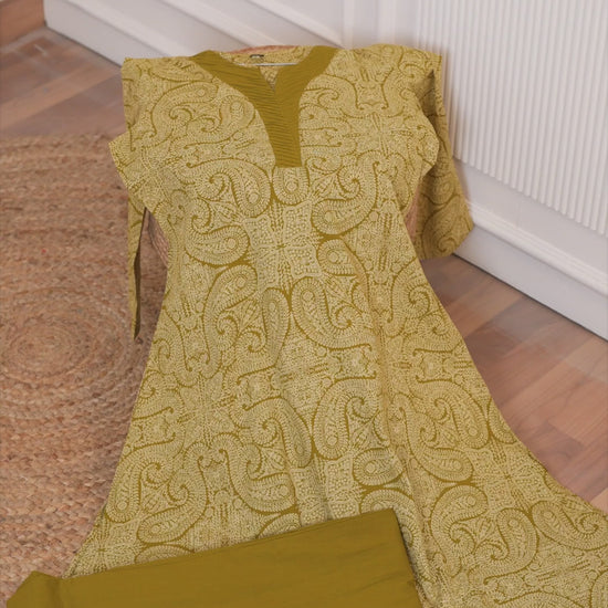 Kurti: Mustard yellow with intricate paisley print, 3/4th sleeves, and contrast neckline