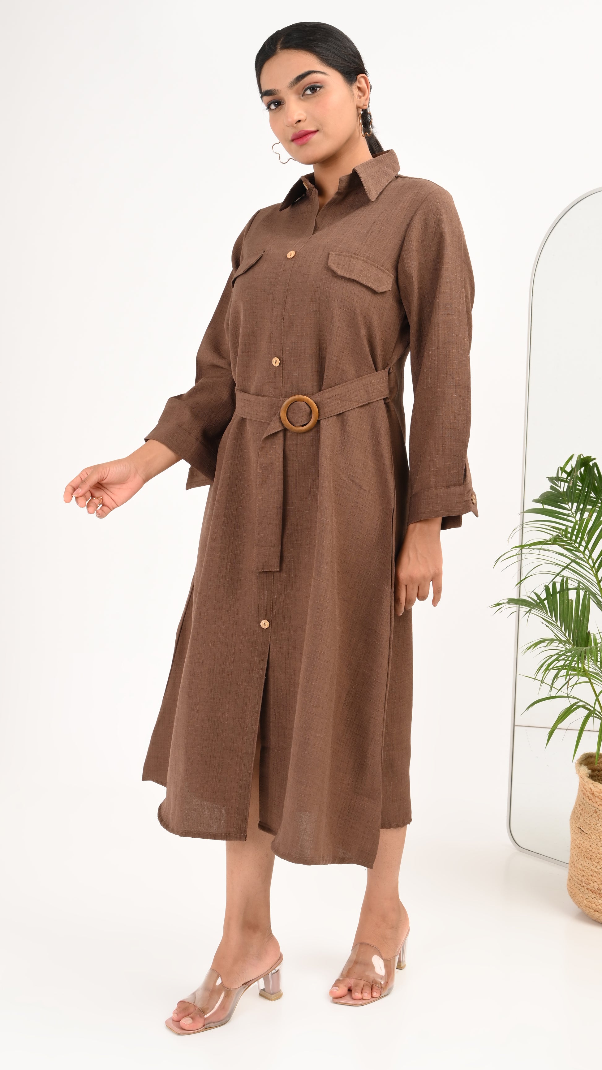 A nod to utility with a touch of elegance — the Cocoa Ridge Belted Midi Shirt Dress is your all-day, anywhere essential. Crafted in a textured cocoa-brown fabric, this collared shirt dress features front flap pockets, wooden buttons, and a matching fabric belt with a wooden buckle that cinches the waist just right. The flared hem and full sleeves bring a graceful finish to this earthy silhouette.