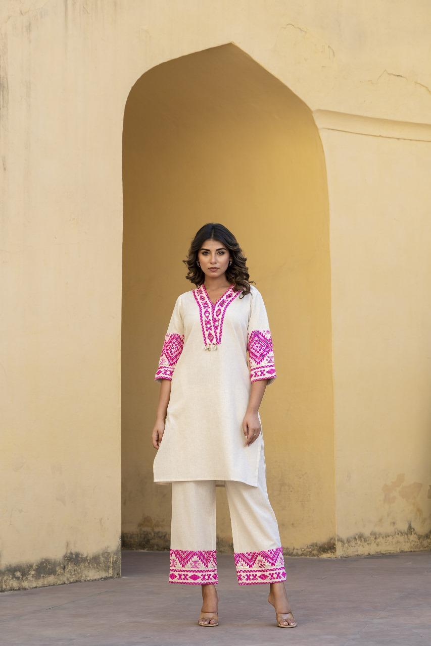 Step into a soft symphony of elegance with the Gulabi Noor Co-ord Set — a dreamy blend of blush-toned embroidery on a soothing cream canvas. The vibrant pink threads add a cheerful charm to the neckline, sleeves, and hem, making this ensemble a graceful head-turner.