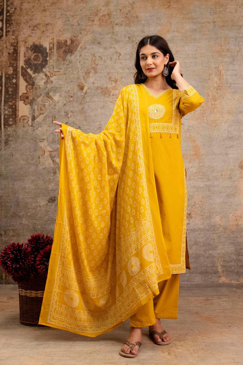 Bright, bold, and beautifully desi — the Gulnaar Mustard Kurti Pant Dupatta Set Suit is a celebration of sunshine and tradition. Featuring intricate white bandhani-inspired motifs over a radiant mustard canvas, this pure cotton ensemble includes a straight-cut kurti, matching pants, and a vibrant dupatta that completes the festive flair.