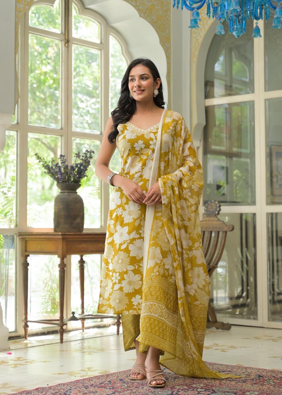 Say hello to radiant mornings in the Gulnaar Sunshine Suit Set — a breezy burst of mustard yellow scattered with ivory florals that instantly uplifts the mood. The sleeveless kurta, paired with a printed dupatta and straight-fit pants, makes this set perfect for light-hearted brunches and elegant festive days.