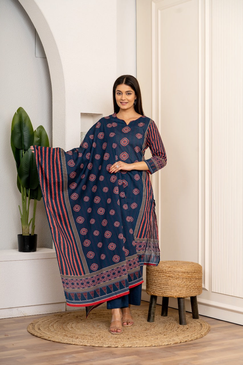 Jaipuri Cotton Kurti Pant Dupatta Set Suit