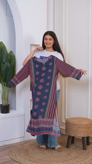 - Print: Traditional Sanganeri hand block print in contrasting red & indigo tones