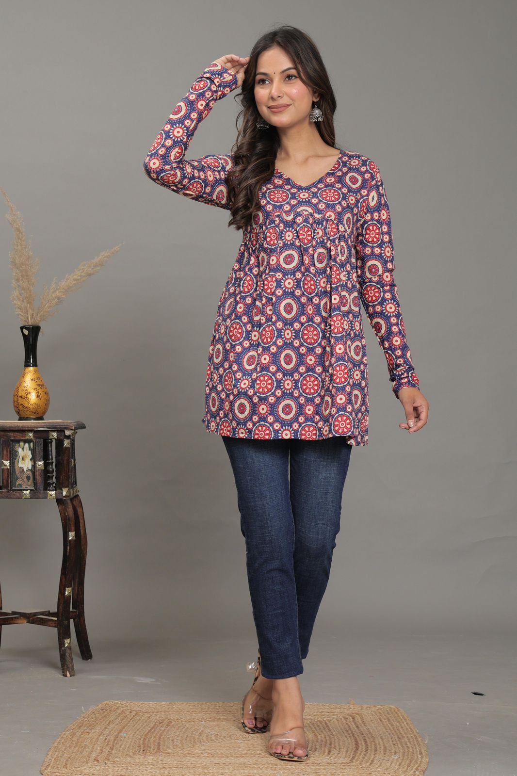 Bring effortless charm to your wardrobe with the Mandala Bloom Short Kurti, crafted from Pure Jaipuri Soft Cotton for everyday comfort. This kurti features vibrant circular mandala-inspired prints in red, white, and indigo hues, giving it a boho-chic vibe while staying rooted in traditional Jaipuri artistry.