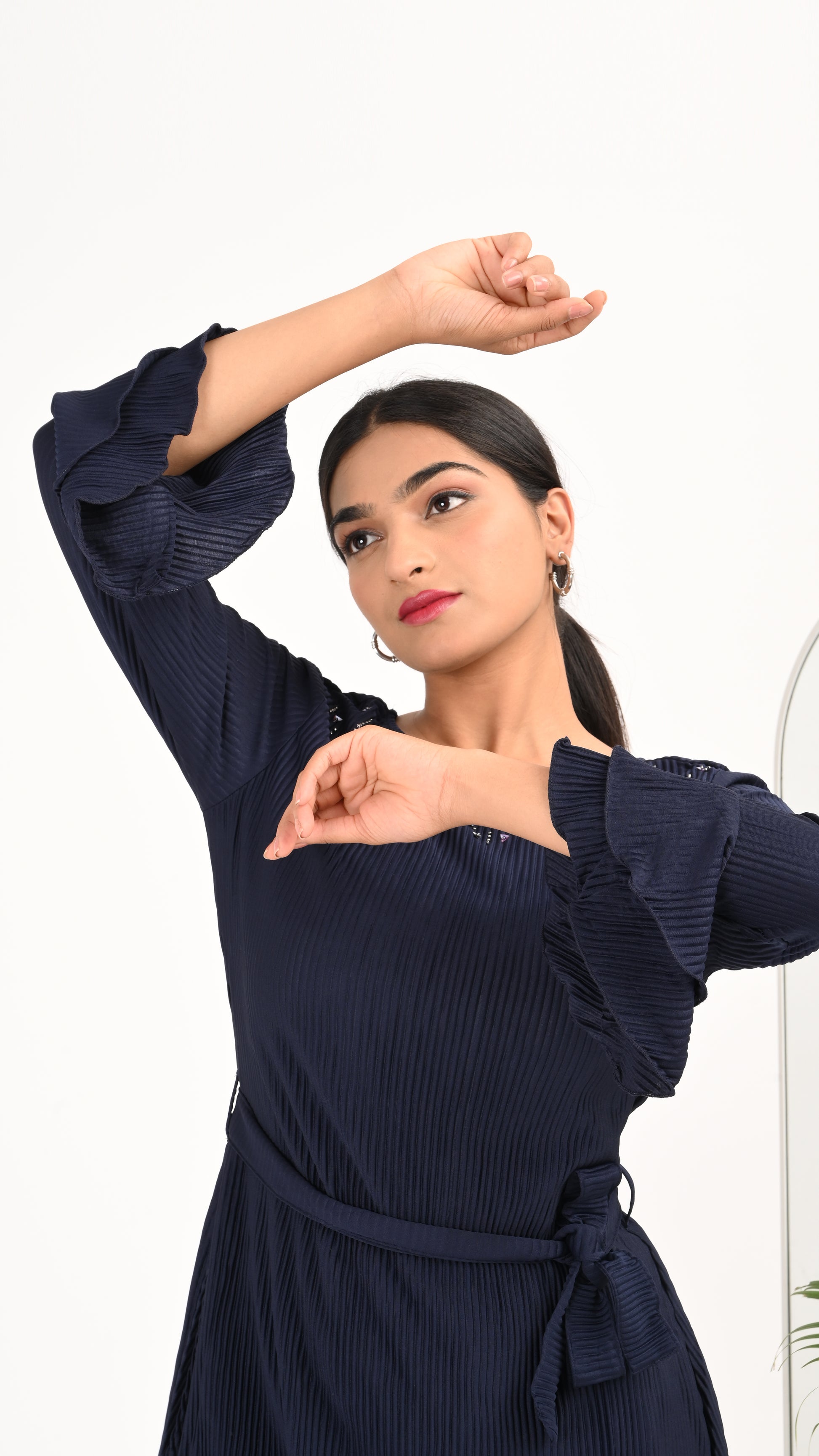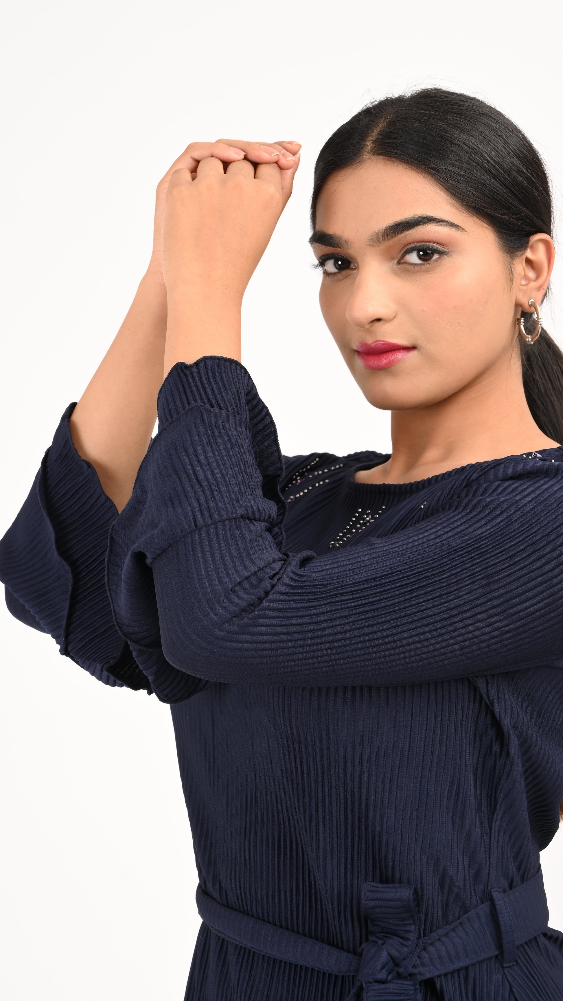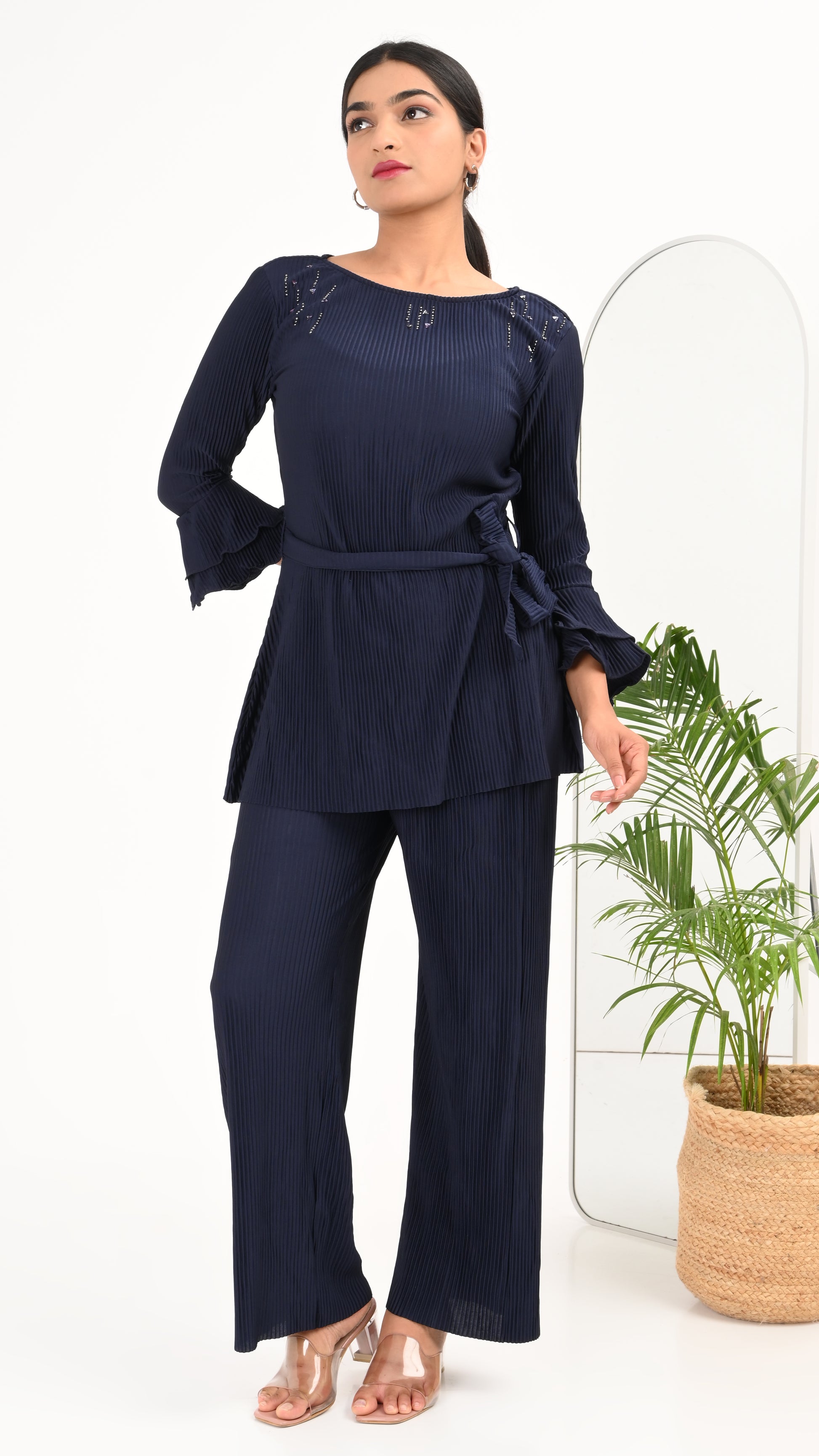 Effortless elegance meets everyday comfort in the Midnight Pleat Co-ord Set — a deep navy ensemble crafted in luxe accordion-pleated fabric. The belted top features delicate sequin accents near the shoulders and ruffled sleeves for a feminine finish, while the wide-leg pants add flow and freedom to your movement. Whether you're stepping out for a brunch or a casual evening, this set ensures you stay effortlessly chic.