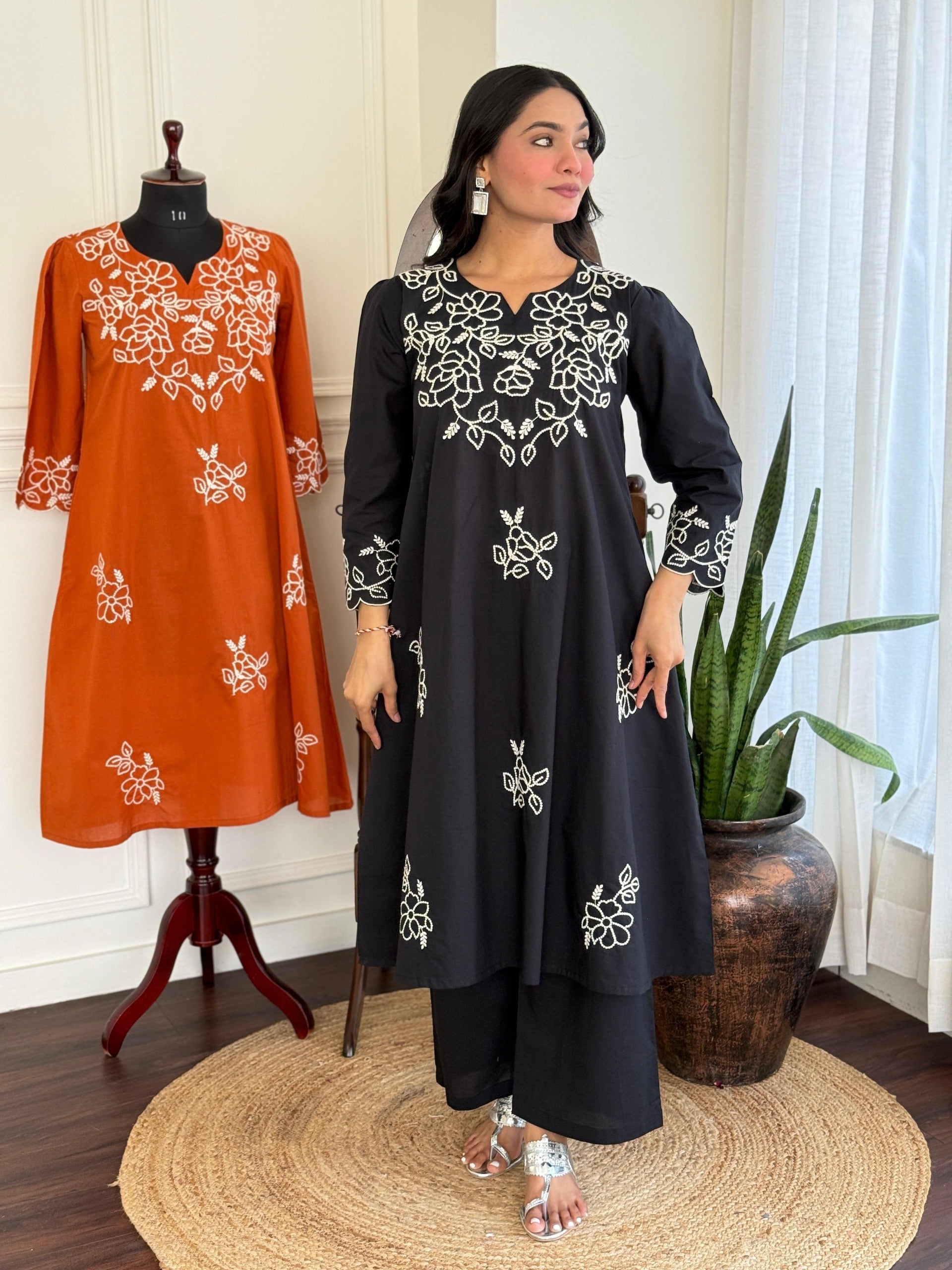 Step into effortless elegance with our Noir Bloom Kurti Pant Set, crafted from pure Jaipuri cotton for all-day comfort. The rich black fabric is adorned with delicate white floral embroidery across the neckline, sleeves, and hem, giving it a timeless and graceful appeal. The straight-cut kurti pairs beautifully with matching cotton pants, making it a versatile outfit for festive gatherings, office wear, or casual outings. Lightweight, breathable, and chic — this set is a must-have addition to your ethnic wardrobe.