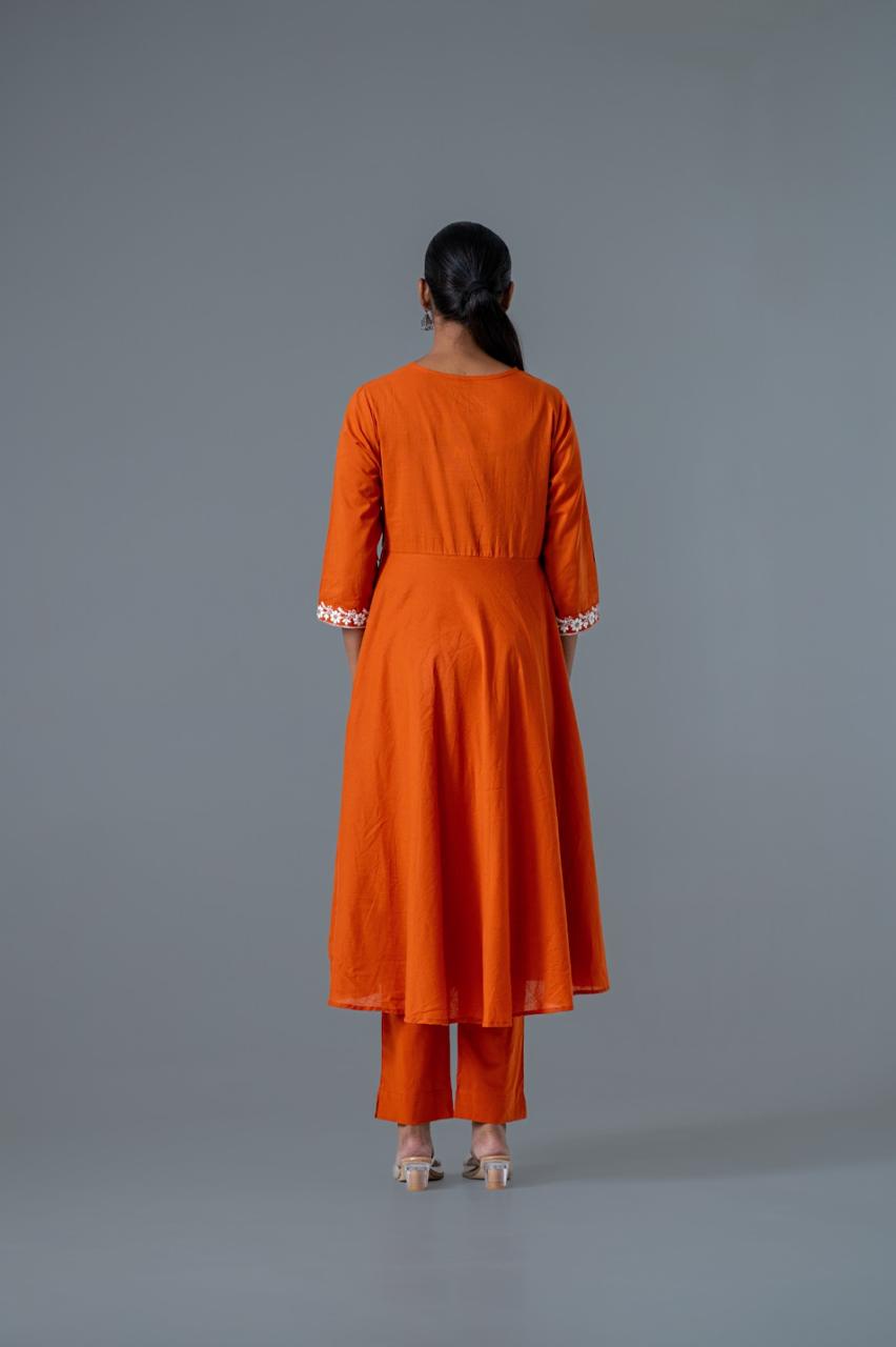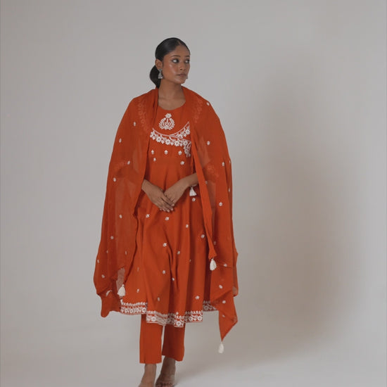 Radiate festive elegance with the Noor-E-Amber Pure Cotton Embroidered Anarkali Set. Crafted in breathable cotton, this vibrant orange Anarkali is adorned with intricate white thread embroidery across the neckline, sleeves, and dupatta. The flowy silhouette, paired with straight pants and a tassel-trimmed dupatta, makes it a perfect blend of tradition and modern charm. Whether for festive celebrations, intimate gatherings, or a graceful everyday look, this set is sure to turn heads.