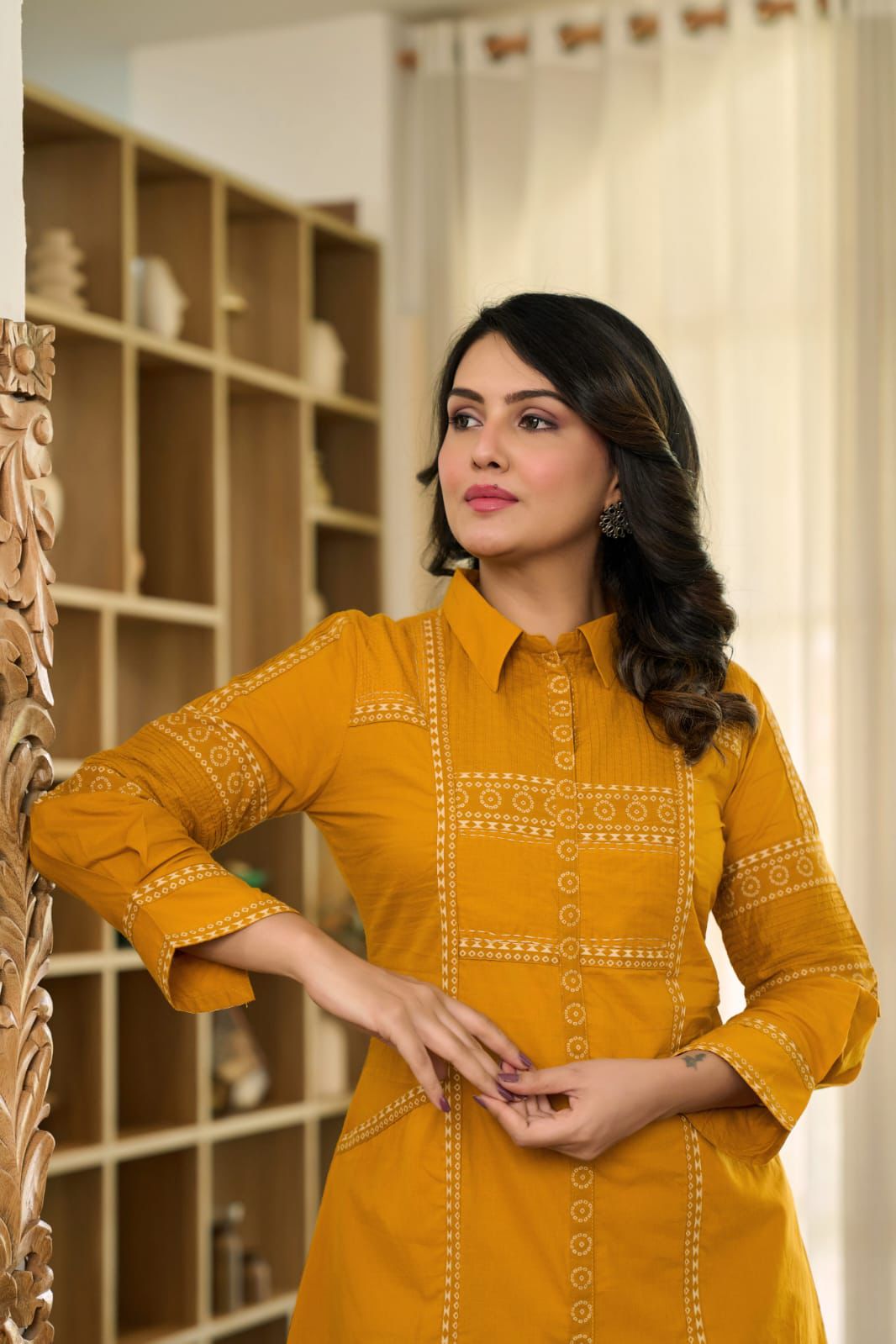 Bright, bold, and rooted in tradition—Ochre Orbit brings a sunshine-soaked twist to ethnic daywear. The collared tunic is detailed with fine folk-style motifs, while the spiral-printed straight pants add a playful charm. It’s an effortless choice for brunches, festive mornings, or a breezy day out.