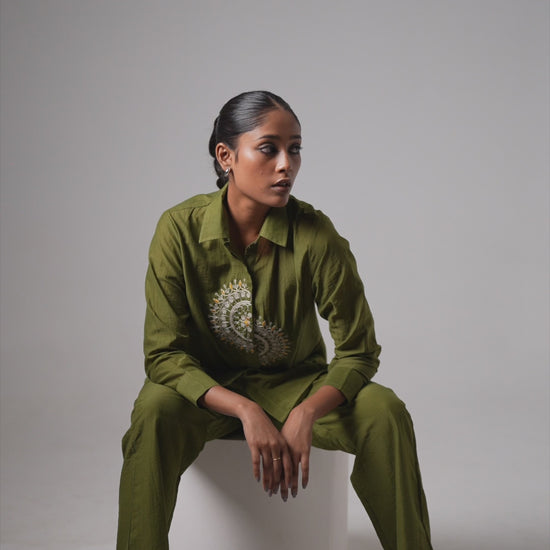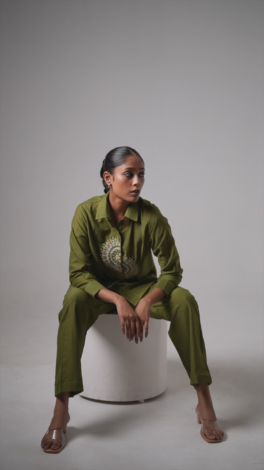 The Olive Grace Mul Chanderi Co-ord Set brings together elegance and comfort in a timeless silhouette. Crafted from luxurious mul chanderi with a breathable cotton inner lining, this set is designed to flatter effortlessly. The collared kurta is adorned with a delicate embroidered motif at the center, lending an artisanal charm to the soothing olive tone. Completed with straight-cut pants, it makes a versatile choice for day celebrations, semi-formal evenings, or festive brunches.