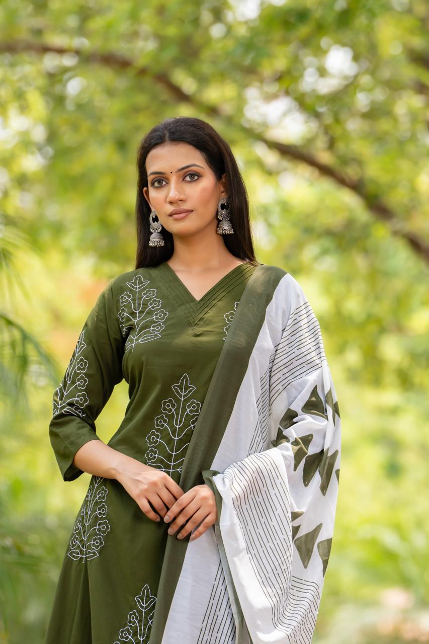 Step into earthy elegance with the Olive Grove Kurti Pant Dupatta Set Suit. Designed in a deep olive green, this cotton ensemble is accentuated with floral embroidery and a modern printed dupatta that brings a perfect balance of tradition and trend.