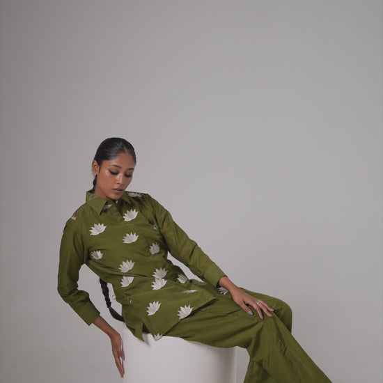 The Olive Lotus Pure Banarasi Mul Chanderi Co-ord Set is an ode to understated elegance. Crafted in premium mul chanderi, this co-ord features delicate handwoven lotus motifs that highlight the rich Banarasi craftsmanship. The earthy olive green shade brings a refreshing twist to ethnic wear, while the button-down shirt paired with tailored trousers makes it effortlessly versatile — perfect for festive occasions, evening outings, or sophisticated daywear.