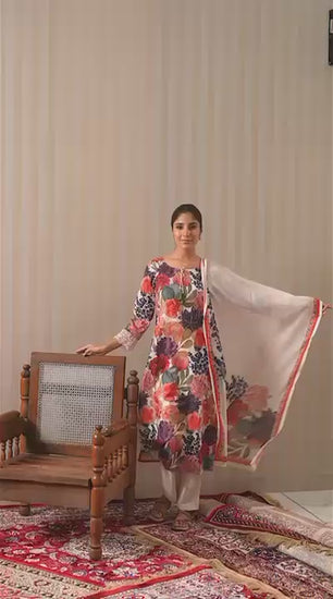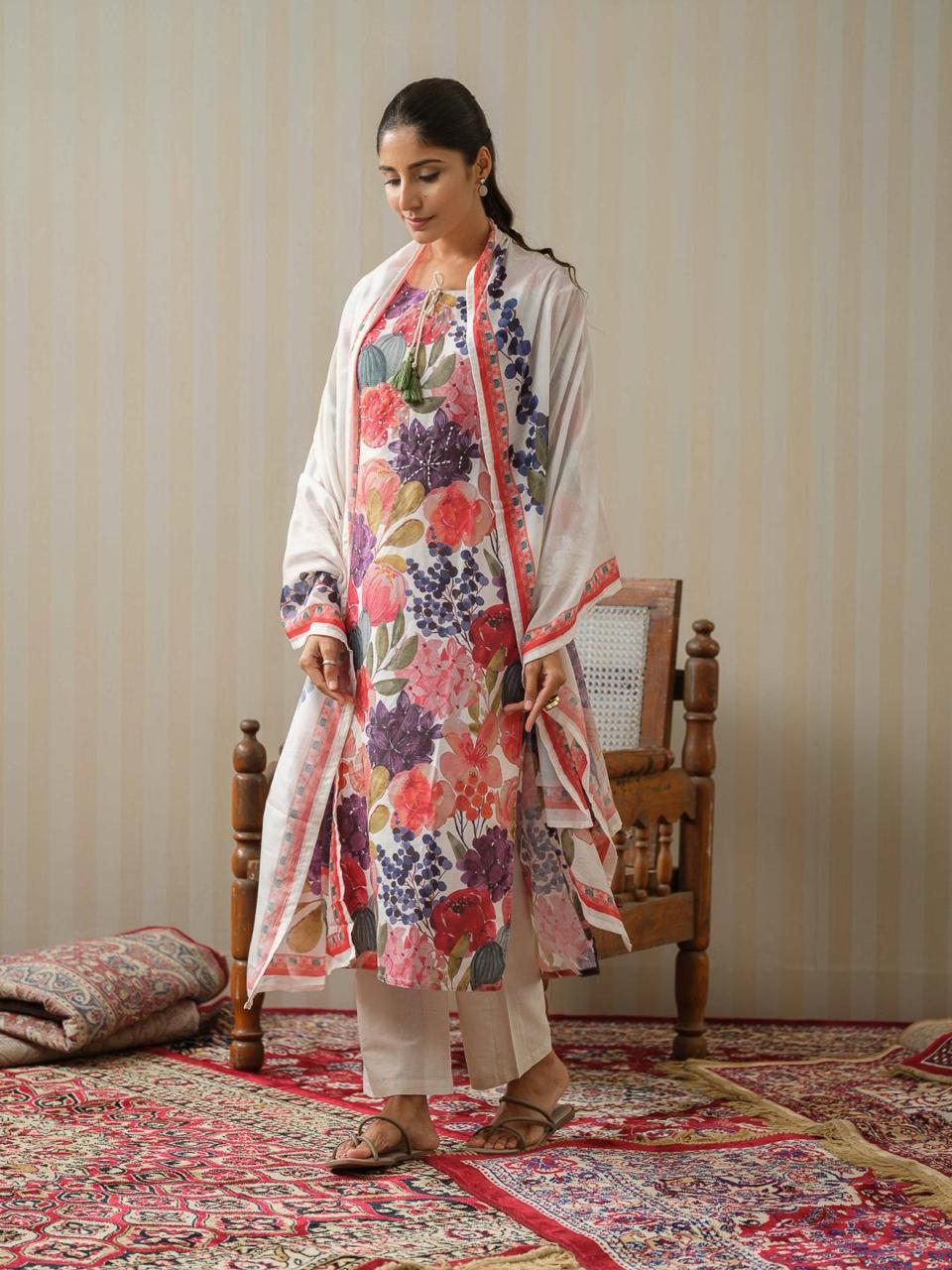 A burst of blooms in every thread — the Phoolwari Charm Suit Set is your floral escape into elegance. With a watercolor-style bouquet of vibrant florals on soft white, this breezy kurta is paired with a complementing dupatta that feels like spring on fabric.