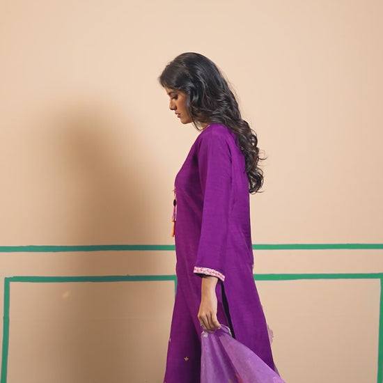 Elevate your festive style with our Royal Orchid Suit Set, crafted in luxurious pure Dola silk with soft cotton lining for comfort and elegance. The rich purple kurti is adorned with delicate embroidery on the neckline, hem, and sleeves, adding a regal touch to its design. Paired with matching pants and a floral printed dupatta in organza-like texture, this ensemble exudes sophistication and charm. Perfect for weddings, festive occasions, or grand celebrations, this set blends traditional finesse with contemporary luxury.