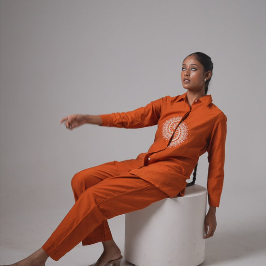 The Rust Glow Mul Chanderi Co-ord Set is an elegant blend of comfort and craftsmanship. Made in premium mul chanderi with a soft cotton inner lining, this co-ord set ensures a graceful drape while keeping you at ease. The collared kurta features a delicate embroidered motif at the center, adding a sophisticated focal point to the rich rust-orange hue. Paired with straight-fit pants, this versatile ensemble can seamlessly transition from workwear chic to evening gatherings.