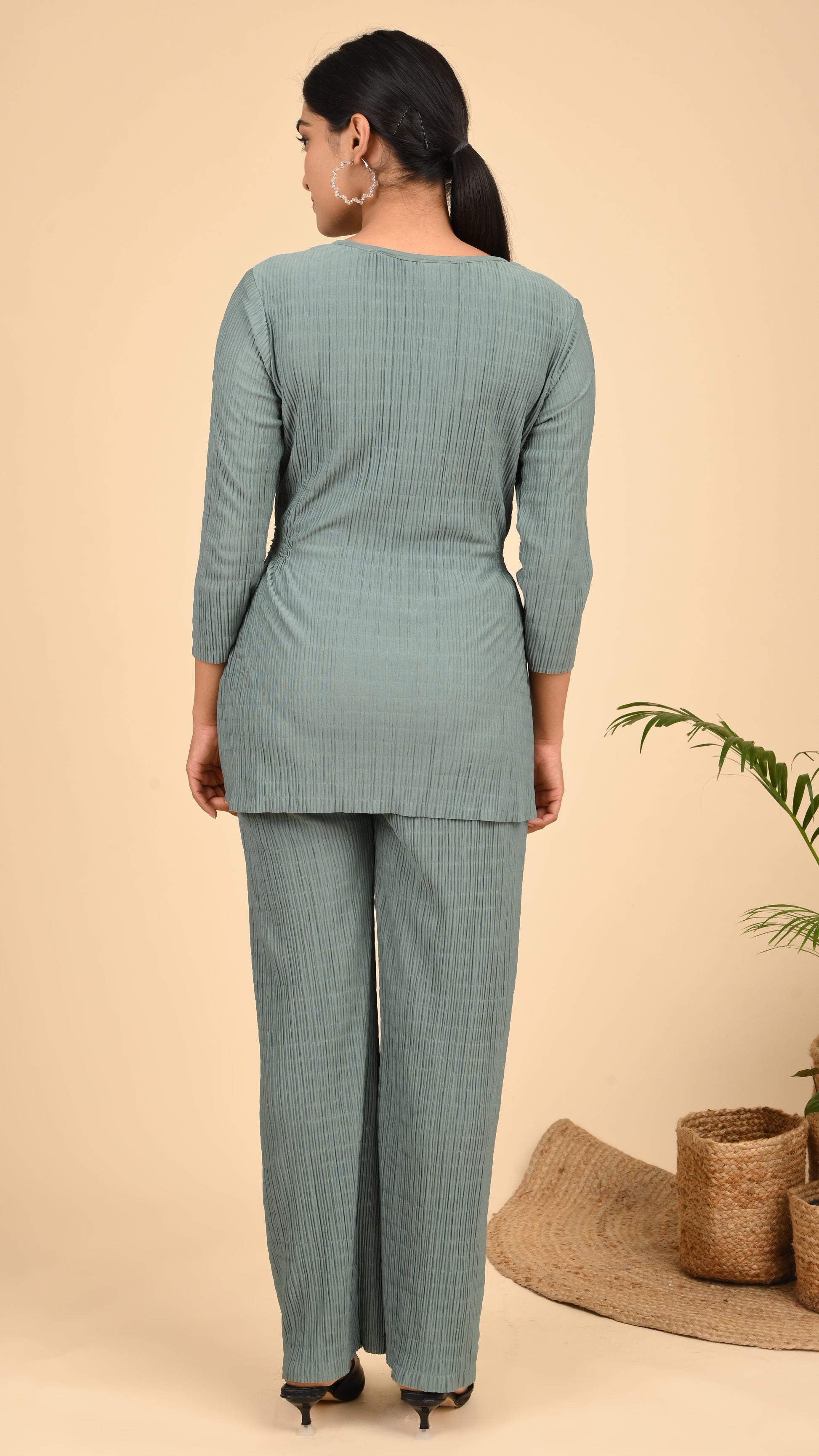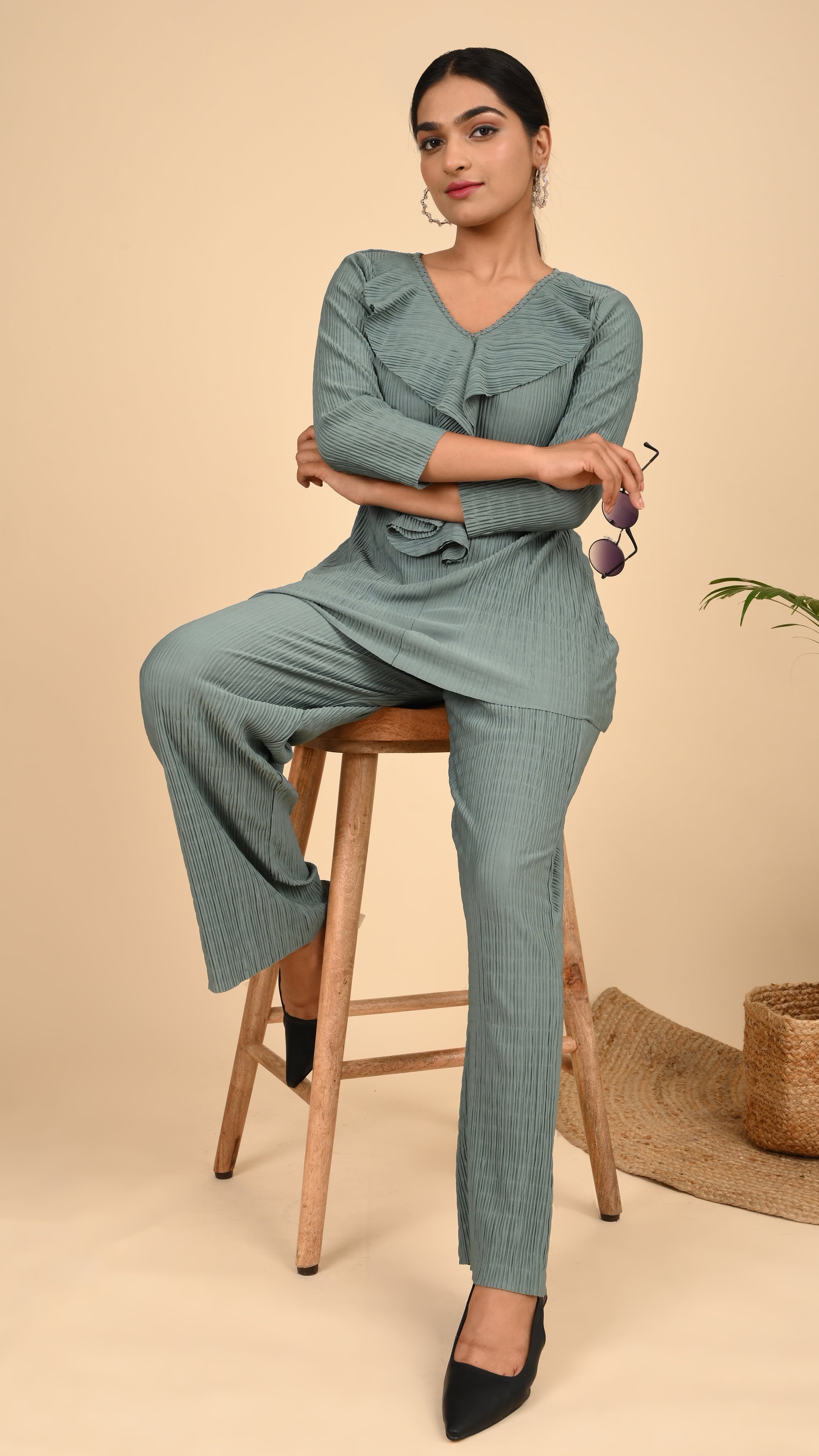 Minimal in tone, elevated in detail — the Sage Cascade Pleat Co-ord Set blends soft structure with flowing lines. The top features vertical pleats and a graceful ruffle trim along the neckline and center, subtly cinched at the waist for a flattering shape. Paired with easy-fit pleated pants in the same muted sage hue, this set brings calm elegance to everyday dressing. Breezy, refined, and versatile enough to dress up or down.