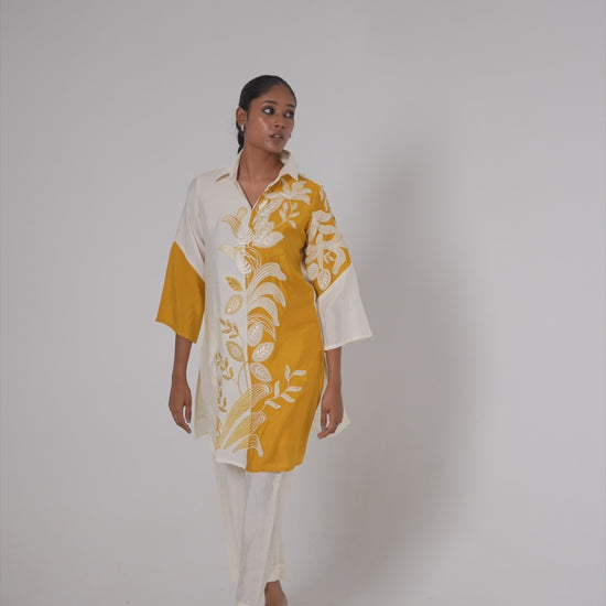 The Sunlit Ivory Muslin Co-ord Set radiates a perfect balance of tradition and chic modernity. Made in soft muslin with cotton lining, the breathable fabric ensures all-day comfort while the design adds effortless elegance. The ivory base is uplifted with mustard yellow accents and detailed embroidery, creating a refreshing contrast that feels both festive and contemporary. Styled with straight ivory pants, this co-ord set makes a statement in minimalism with a pop of vibrance.
