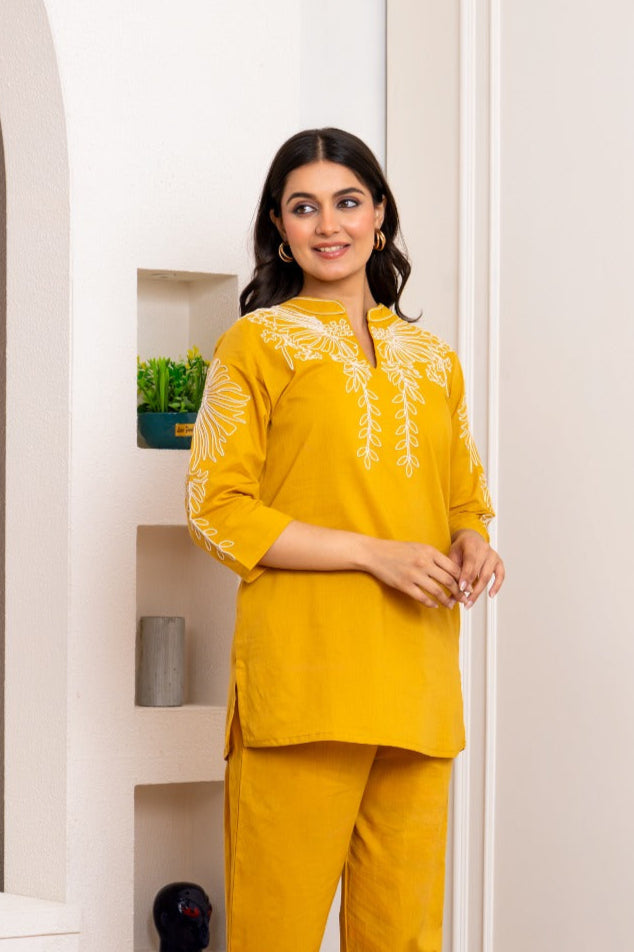 Wrap yourself in the warmth of tradition with our Sunshine Symphony Jaipuri Co-Ord Set – where radiant mustard hues meet elegant white embroidery in a melody of comfort and charm. Crafted from breathable, 100% Jaipuri cotton, this effortlessly stylish outfit is perfect for lounging in luxury or stepping out with grace. The intricate threadwork on the neckline and sleeves adds a touch of artisanal flair, making this set a sunny standout in your ethnic wardrobe. Pair it with juttis and hoops for a look that's both rooted and radiant.
