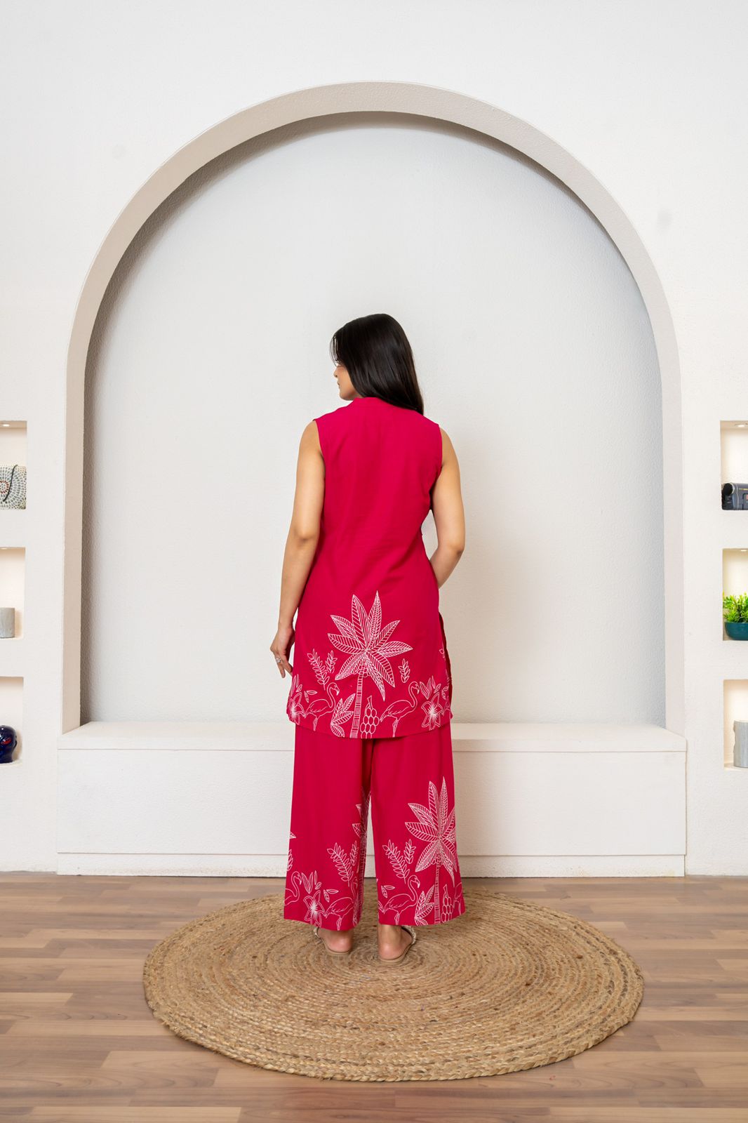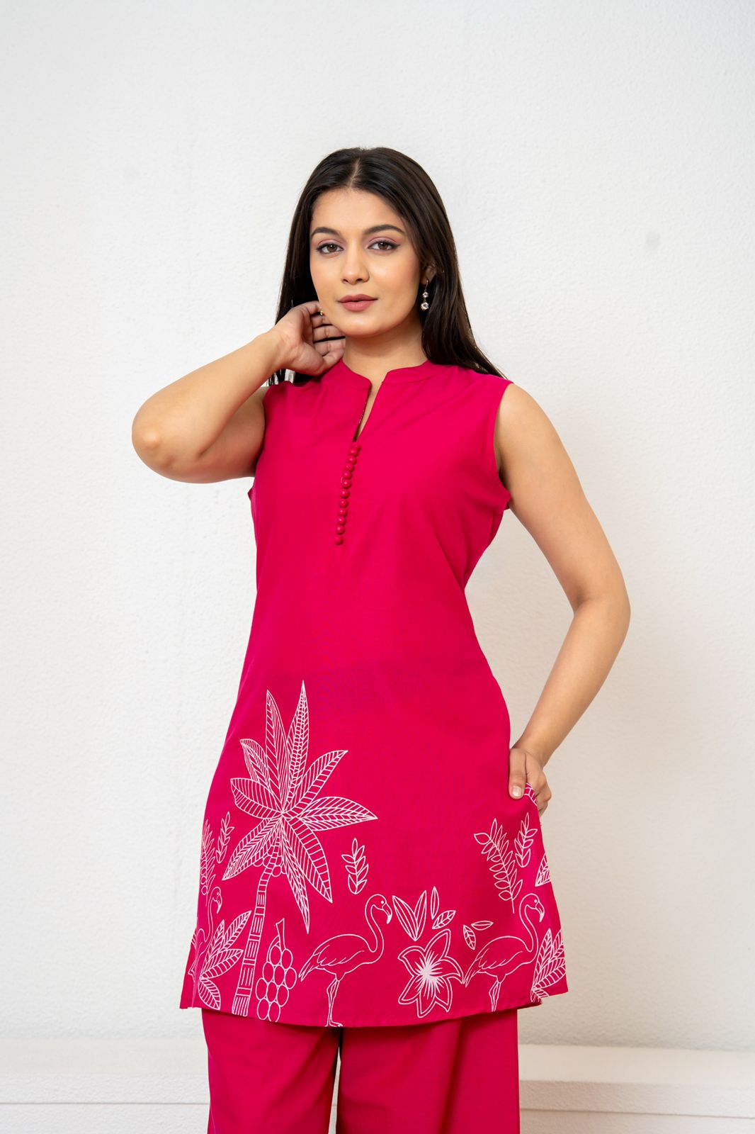Bring on the summer vibes with the Tropical Bloom Pink Co-ord Set — a vibrant sleeveless outfit designed to keep you cool, comfy, and effortlessly chic. Featuring tropical flamingo and floral prints in subtle contrast white, this fuchsia pink ensemble is playful yet polished.