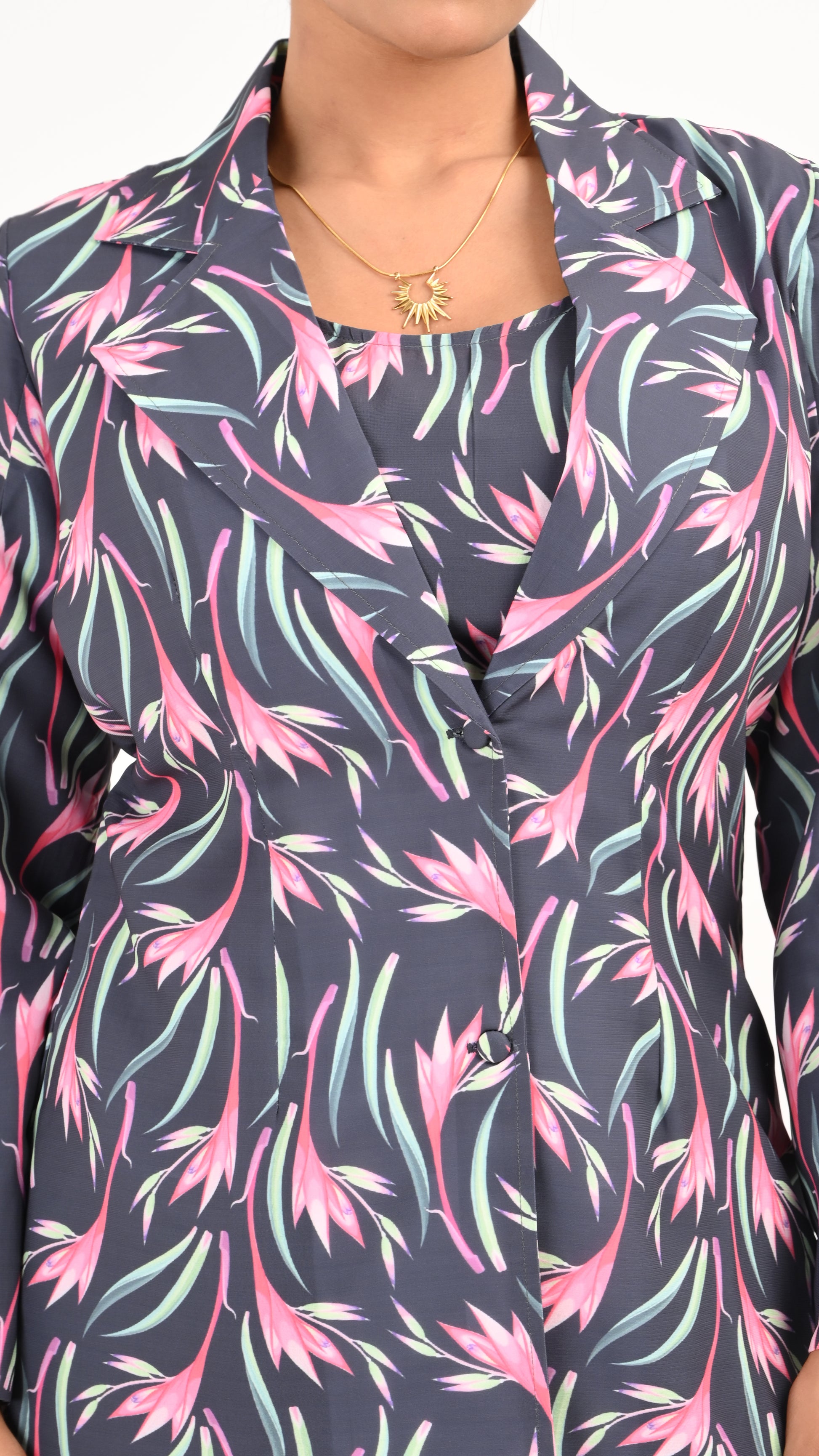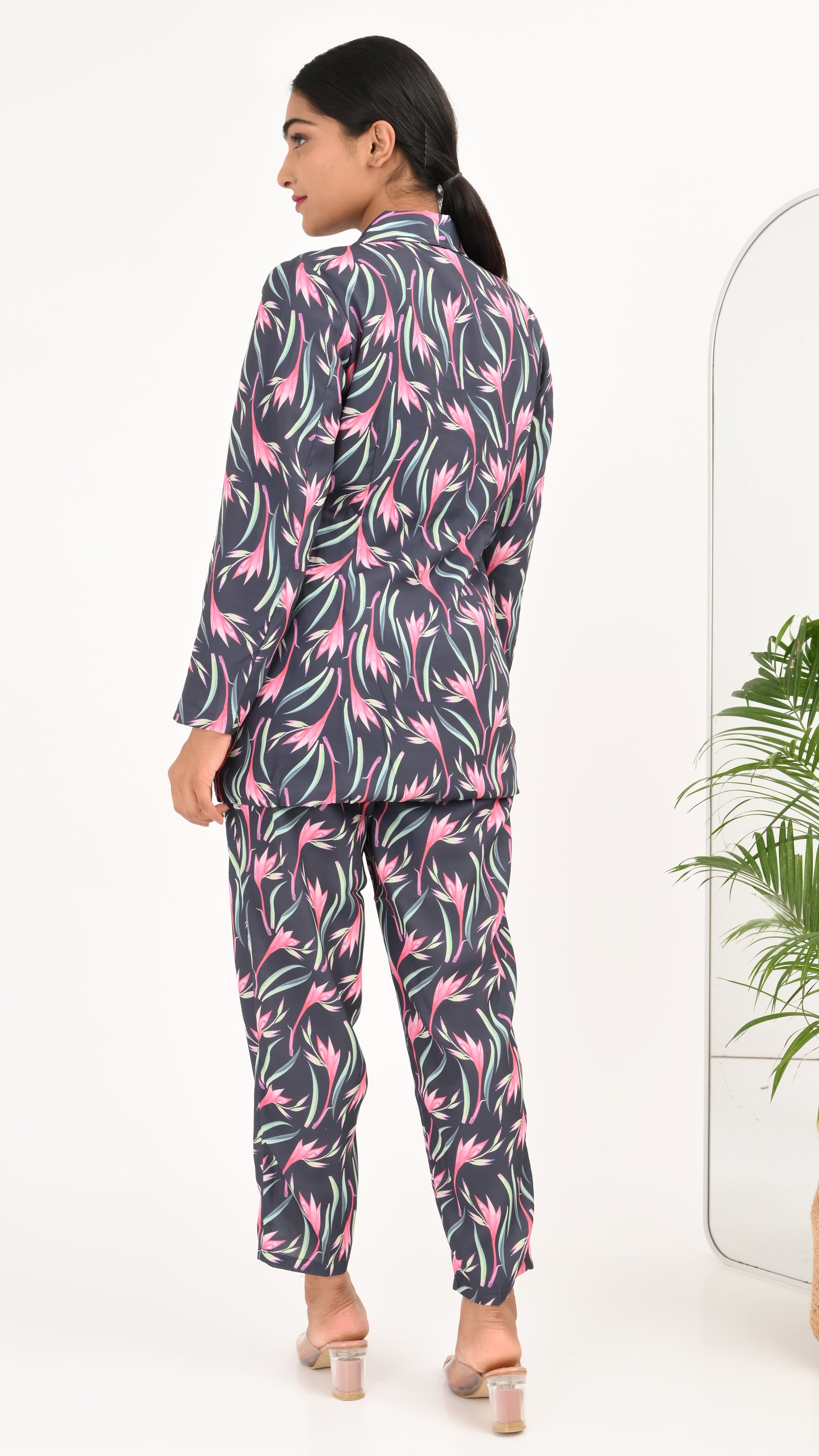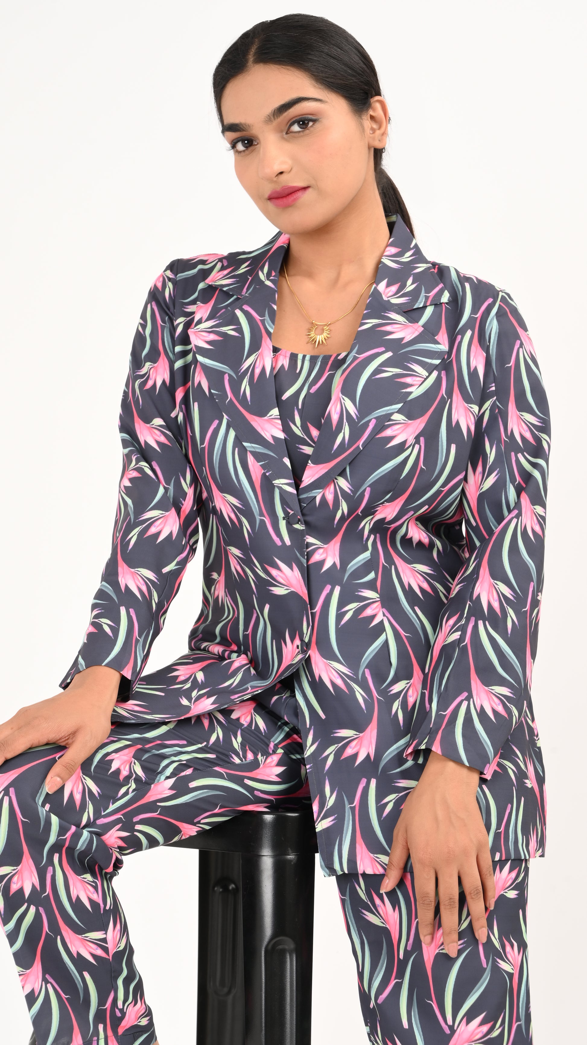 Bold blooms meet sleek structure — the Tropink Noir Co-ord Set is your wardrobe’s tropical power move. Designed with a sculpted sweetheart top and matching straight-cut pants, the dark green base sets the stage for vibrant pink botanical prints to pop. Tailored yet playful, this set commands attention from beachside cafés to city brunches.